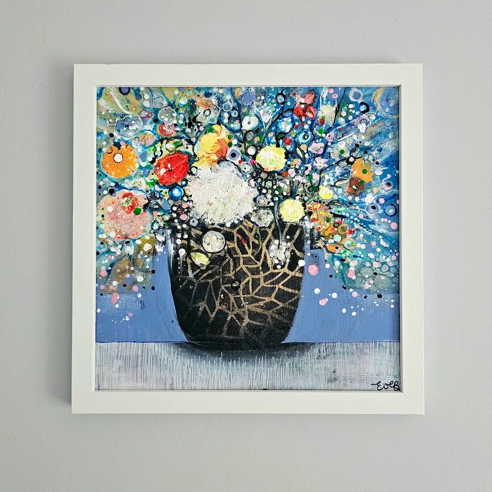 Inspired by the exuberance and vitality of fresh blooms, this piece radiates colour and movement. A boldly patterned vase anchors the composition, overflowing with an explosion of abstract florals. Each brushstroke and textured detail is designed to capture the lively spirit and personality of flowers in full bloom. The slightly abstract style invites the viewer to experience the energy and emotion behind the petals, making this painting a true statement piece for any room.